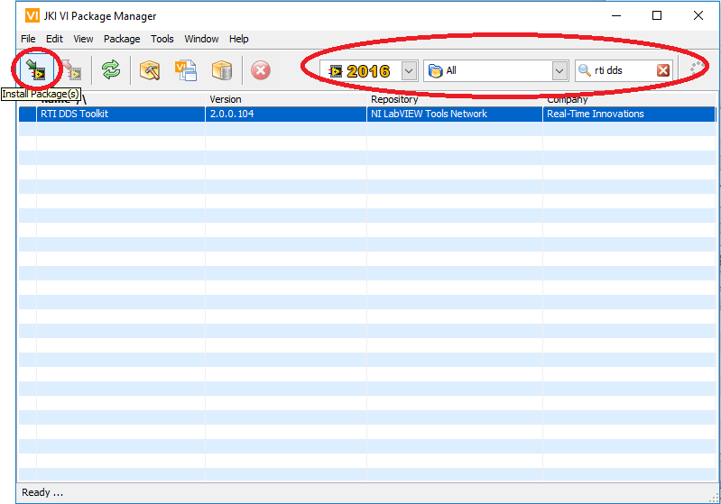 In versies voorafgaand aan LabVIEW 2017 kunt u onze toolkit vinden in het LabVIEW Tools Network. U kunt het downloaden via de VI Package Manager. Zoek naar 'rti dds' in het zoekvak en klik vervolgens op de knop 'Pakket(en) installeren':